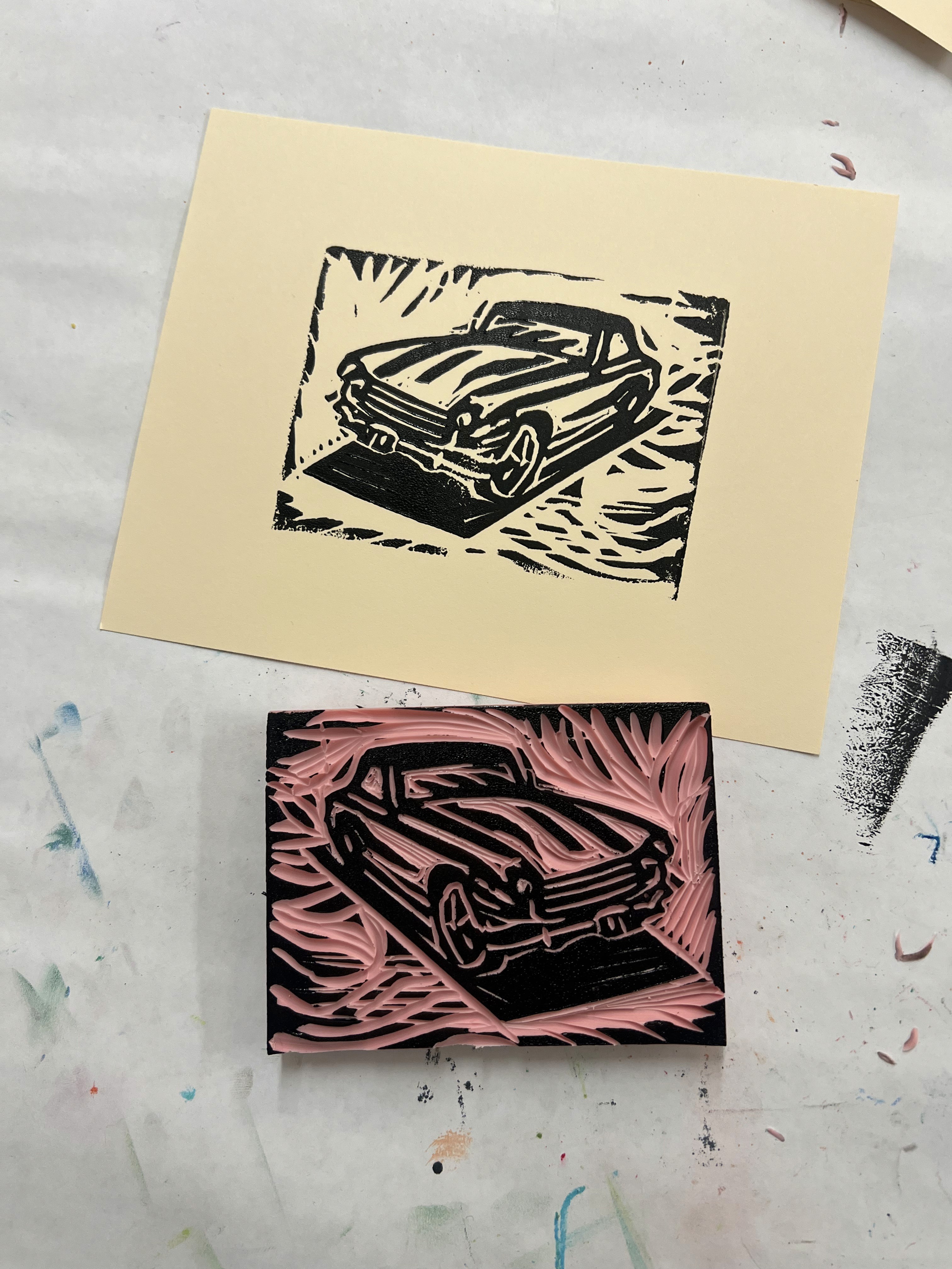 card stock prints of your stamp in black block-printing ink